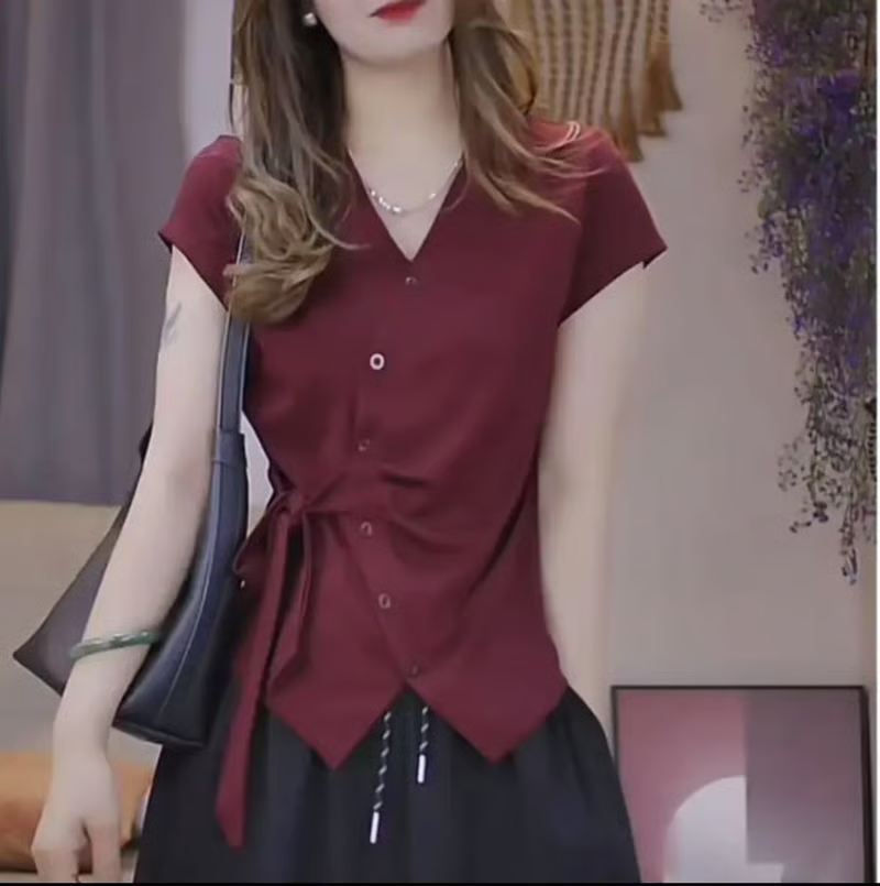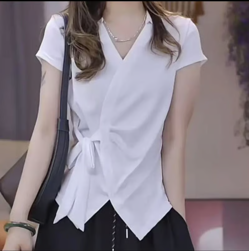 半小時前夏季新款重工不規則設計短袖時尚綁帶V領T恤女修身顯瘦上衣女 - 【超值團購】到手3件-NT$1699